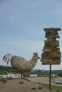 Ganz witzig ist das Städtchen Chicken, etwa 40 km vor dem amerikanisch-kanadischen Grenzübergang gelegen. Während des Goldrauschs fanden sich hier einige Goldsucher ein und ernährten sich – außer von Whiskey – von den dort häufig vorkommenden Alpenschneehühnern, englisch Ptarmigan. Als 1902 ein Postamt eröffnet wurde, sollte der Ort entsprechend Ptarmigan heißen, da das aber niemand aussprechen konnten, nannte man den Ort kurzerhand Chicken. Über den Winter, wenn der Highway geschlossen ist, wohnen dort ganze vier Menschen. Eine Bar, gibt es, ein Futterhaus und tolle Plumsklos. Ach ja …die Plumsklos überall…wie sie mir fehlen…