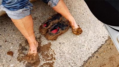 Also gut. Mit letzter Kraft zog ich meine linke Hand aus dem zähen Schlamm, zog den rechten Fuß aus dem Schuh, zog den Schuh aus dem Schlamm und führte die gleiche Aktion mit dem anderen Fuß durch. Und immer bampelte (bampeln = nordbadisch für baumeln, Anm. der Verfasserin) der teure Fotoapparat, den ich um den Hals hängen hatte, wenige Zentimeter über dem Schlamminferno .